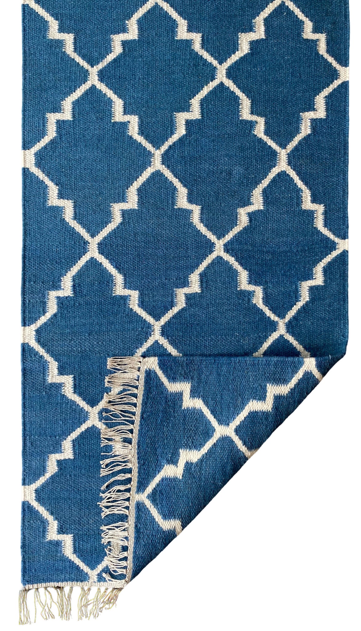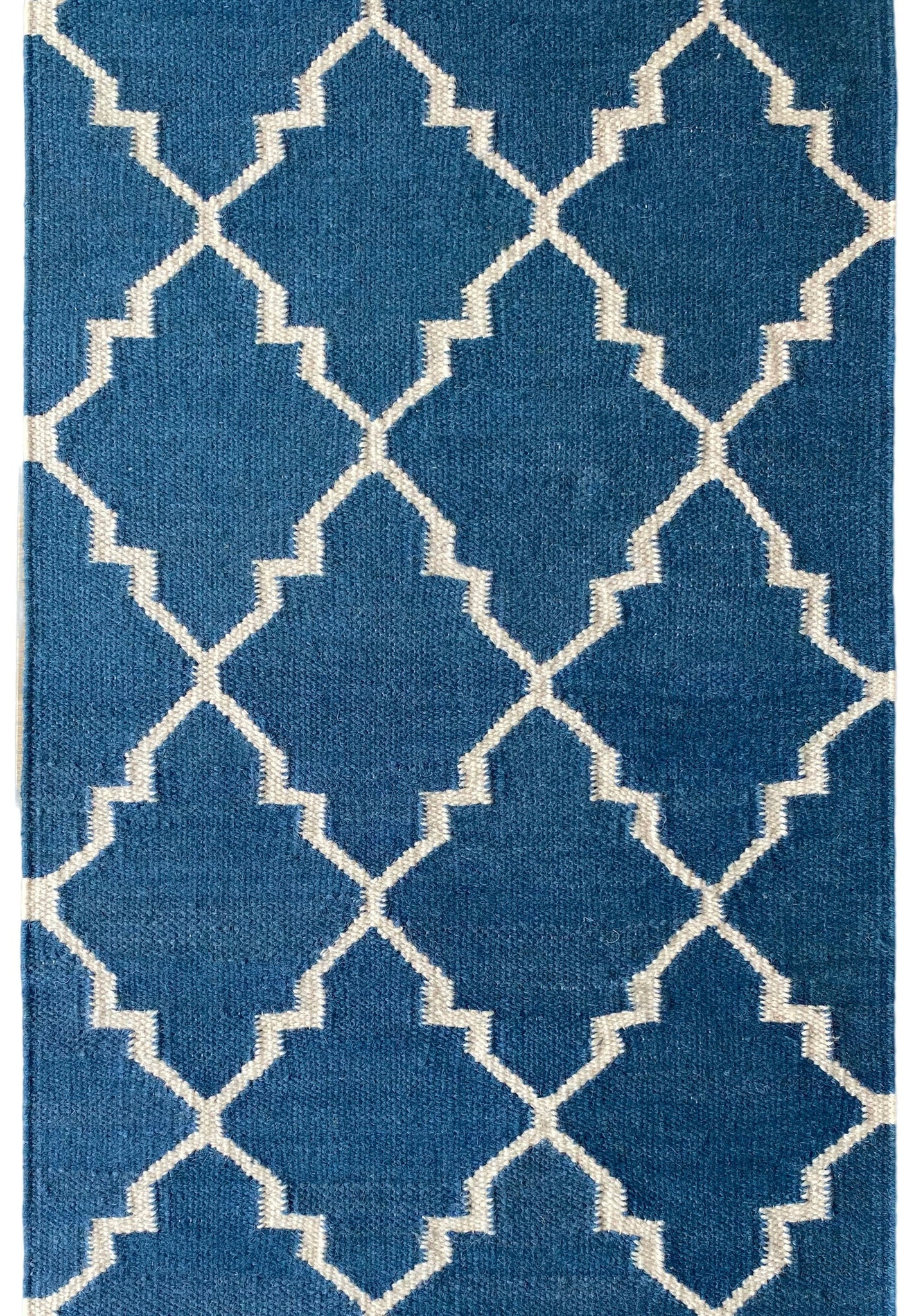 The beautiful Oxford Trellis rug features a rich blue base with an intricate cream pattern woven throughout, creating a harmonious and elegant contrast. The soft wool adds warmth and comfort, while the cream fringe detail enhances the rug’s refined look. Handcrafted with care, this piece combines timeless style with luxurious texture, making it a perfect addition to any room in need of both colour and sophistication.