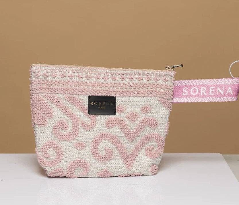 Our exclusive collection of Sorena clutch bags - a perfect blend of elegance and practicality. Each clutch is meticulously handcrafted, adding a sophisticated touch to your outfits. The 'Calliope' clutch features hues of cream and light pinks in a detailed pattern,  effortlessly elevating your style for any occasion. An essential accessory, sure to become your favourite travel companion.