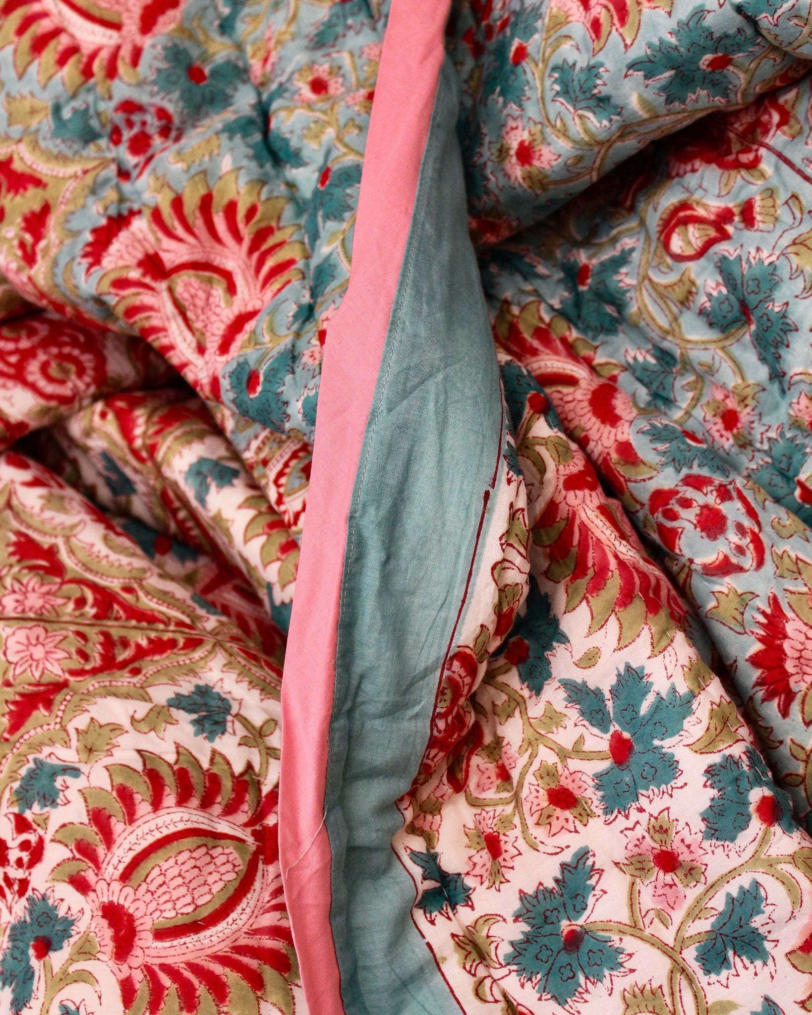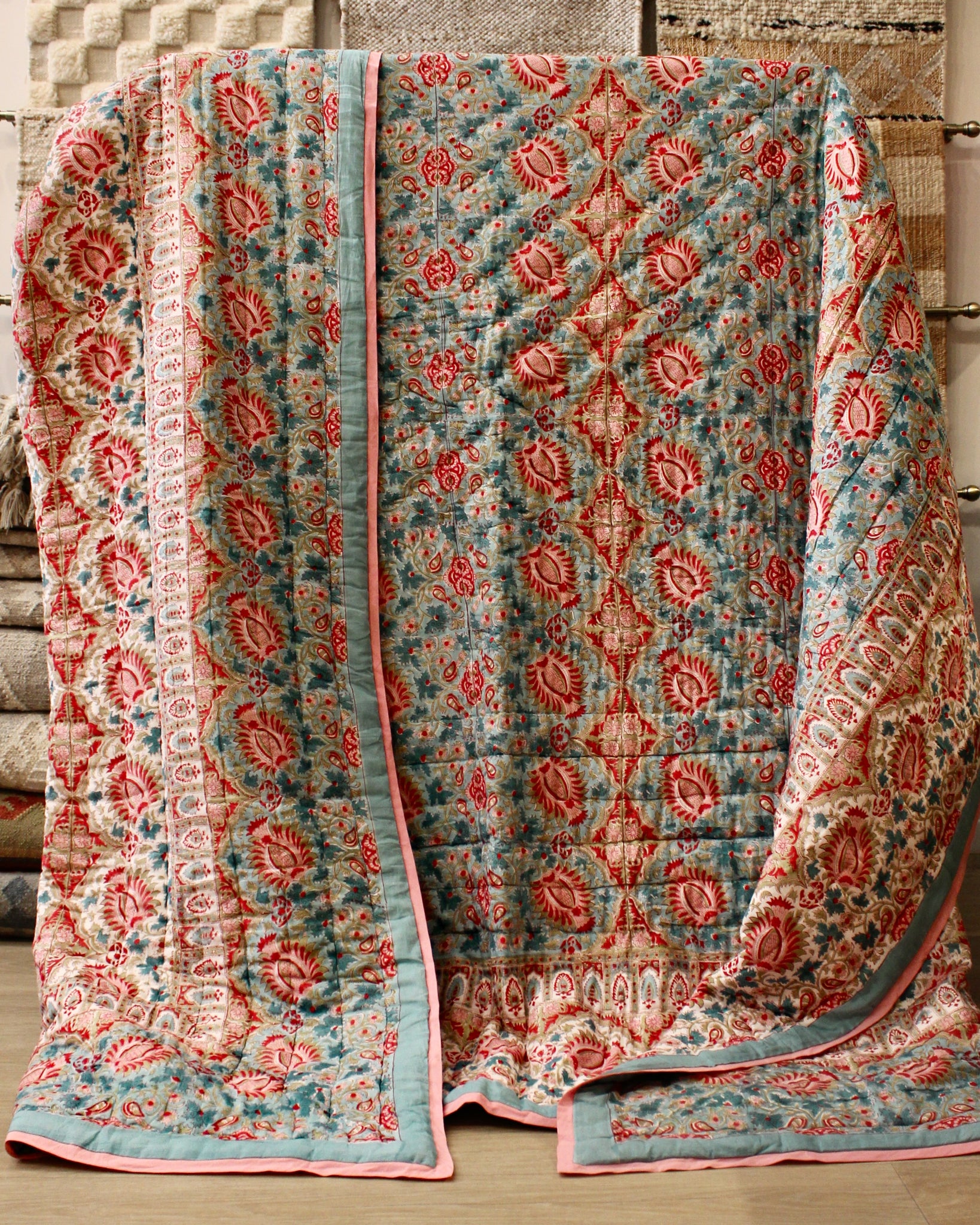 Our Teal & Rose Garden Quilt is crafted from 100% organic cotton and handstitched by skilled artisans in India. Using hand block printing, the patterns are carved into wooden blocks, dipped in natural dyes of rich teal and pink, and stamped onto the fabric. This process is repeated to create a bold, beautiful design. The quilts are then filled with 100% cotton and stitched for a final touch.