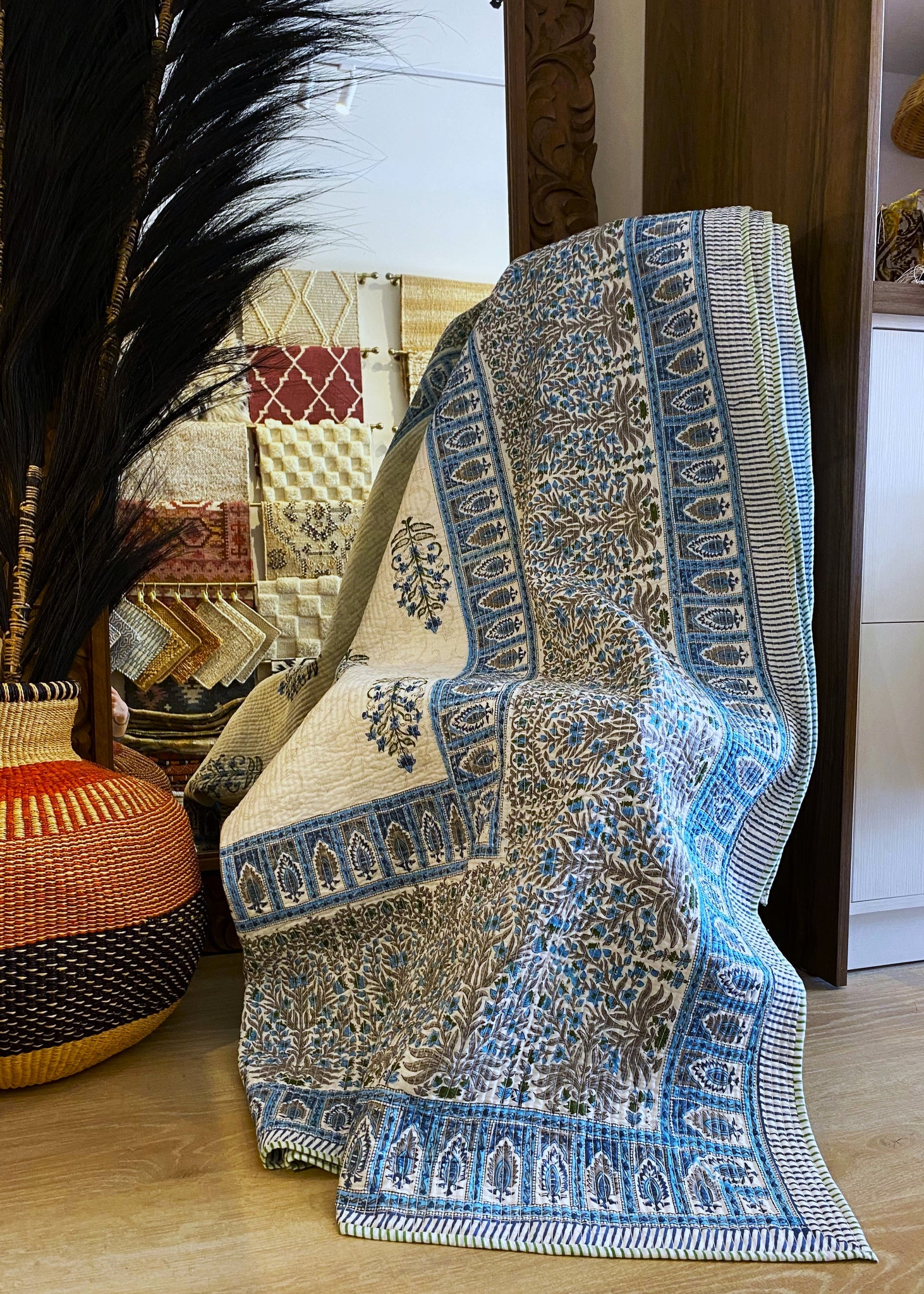 Our Jaipur quilts are crafted from 100% organic cotton by skilled artisans in India. Using hand block printing, patterns are carved into wooden blocks, dipped in natural dyes, and stamped onto the fabric. This process is repeated to create a bold, beautiful design. The quilts are then filled with 100% cotton and stitched for a final touch.