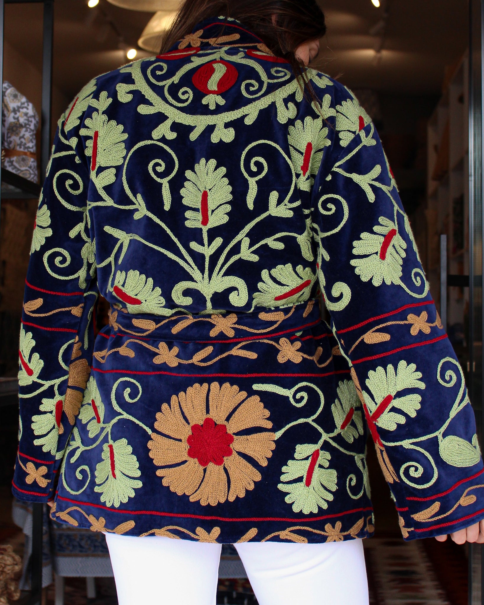 Introducing our Heritage Velvet Jacket Midnight, celebrating timeless craftsmanship and expressive design. This jacket is thoughtfully crafted from rich velvet and adorned with intricate embroidery, showcasing the skill and artistry behind this piece. Defined by bold colours and distinctive patterns in green, crimson and light amber, this jacket is designed to stand out, making it a true statement in any wardrobe.
