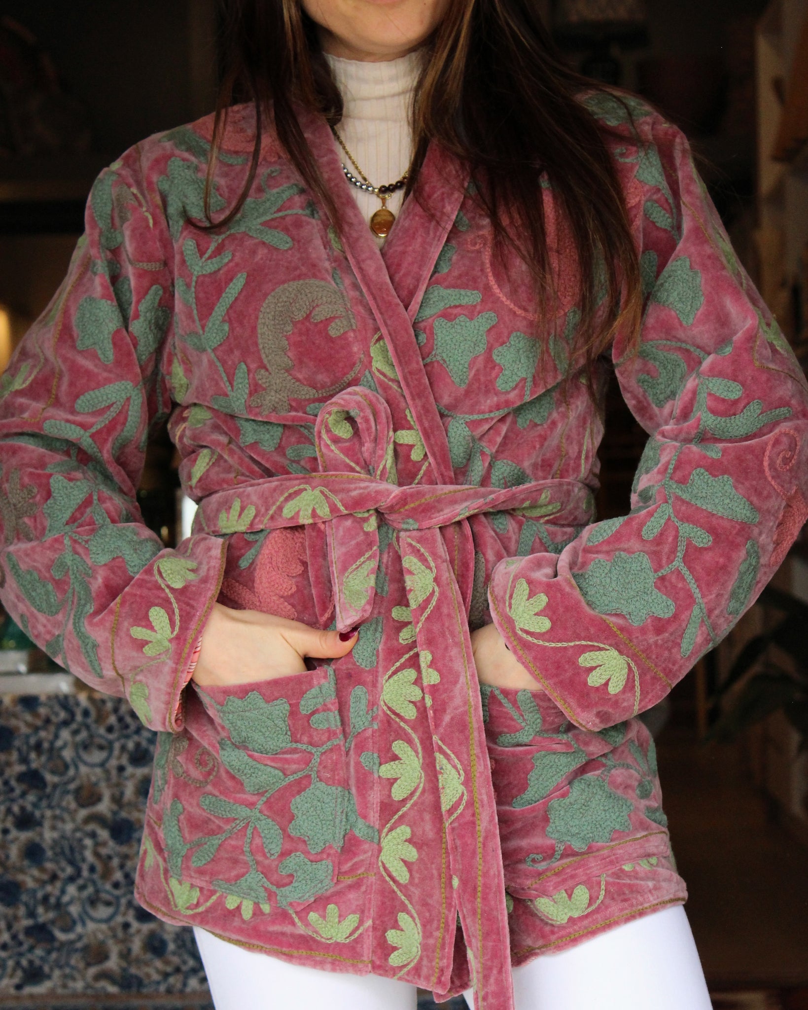 Introducing our Heritage Velvet Jacket Rosewood, celebrating timeless craftsmanship and expressive design. This jacket is thoughtfully crafted from rich velvet and adorned with intricate embroidery, showcasing the skill and artistry behind this piece. Defined by bold colours and distinctive patterns in pink, green and creams, this jacket is designed to stand out, making it a true statement in any wardrobe.