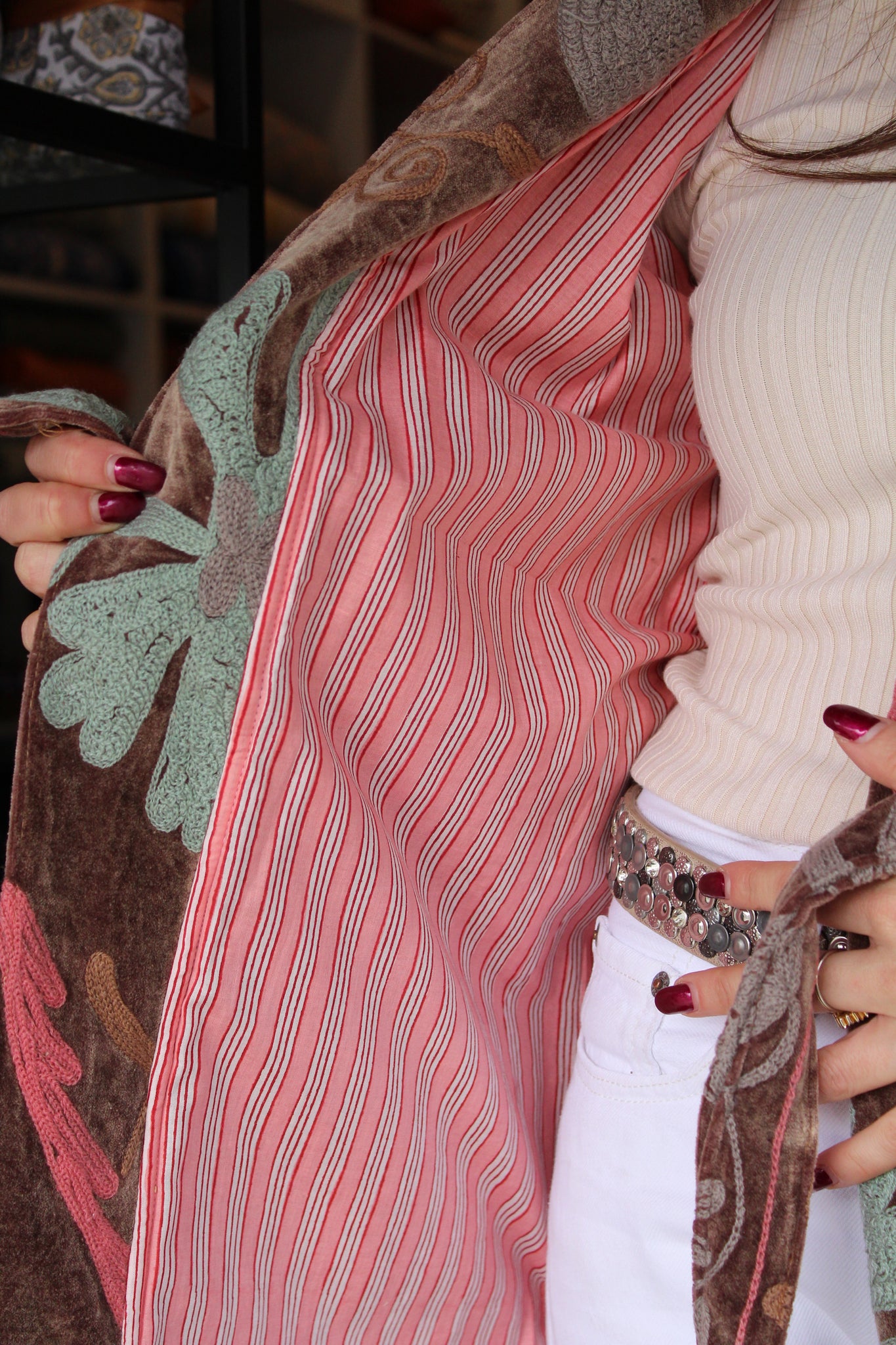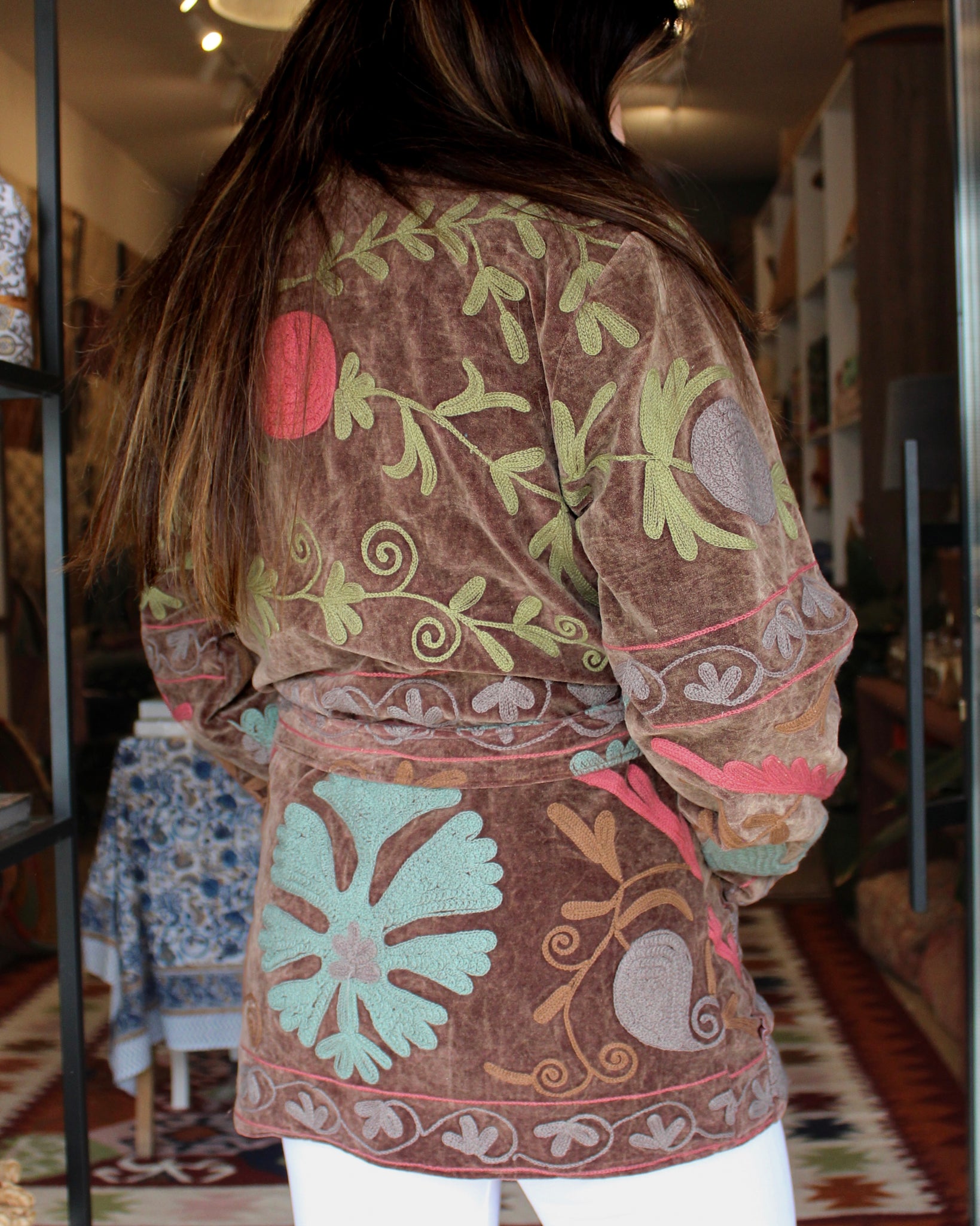 Introducing our Heritage Velvet Jacket Taupe, celebrating timeless craftsmanship and expressive design. This jacket is thoughtfully crafted from rich velvet and adorned with intricate embroidery, showcasing the skill and artistry behind this piece. Defined by bold colours and distinctive patterns of beautiful green, pink and blue colours, this jacket is designed to stand out, making it a true statement in any wardrobe.