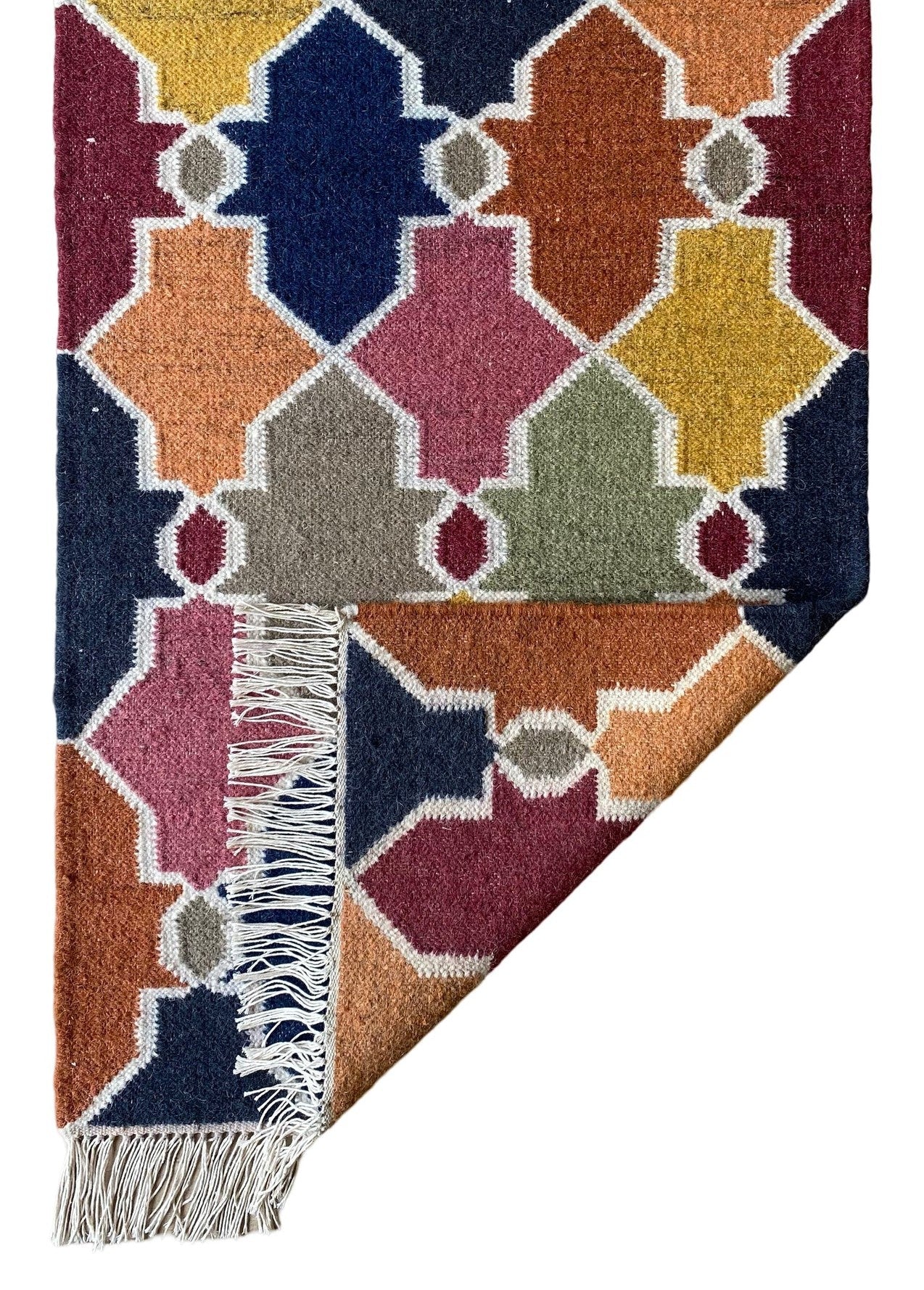The Liberty Kilim showcases a stunning array of vibrant colours, with bold geometric motifs woven into a lively pattern. Rich hues of burgundy, yellow, and navy blue are beautifully contrasted against a cream backdrop, creating an eye-catching design that feels both modern and traditional. Handcrafted by skilled artisans, the Liberty Kilim blends striking colour with expert craftsmanship, making it a perfect statement piece for any room that craves a touch of vibrant elegance and cultural flair.