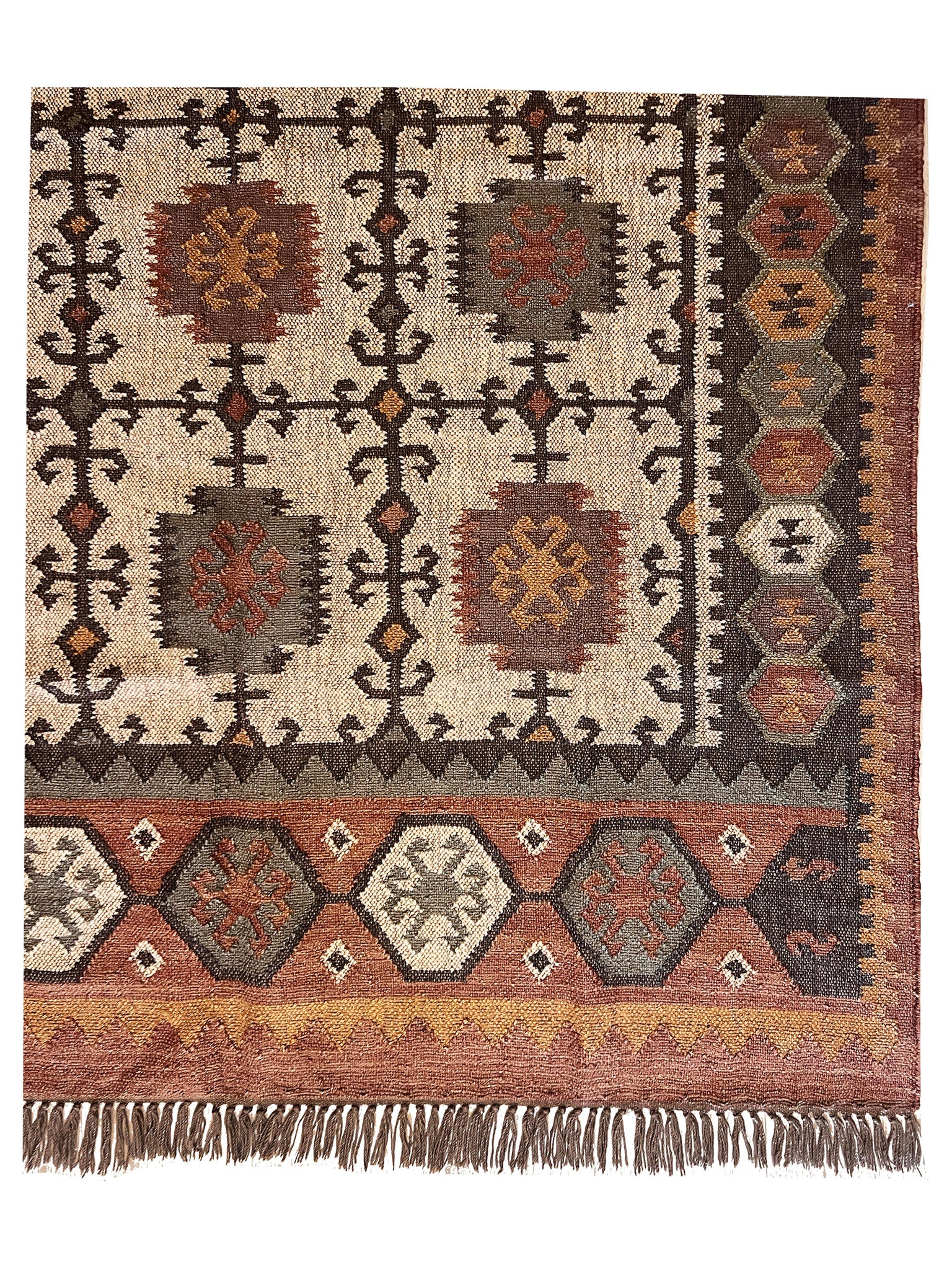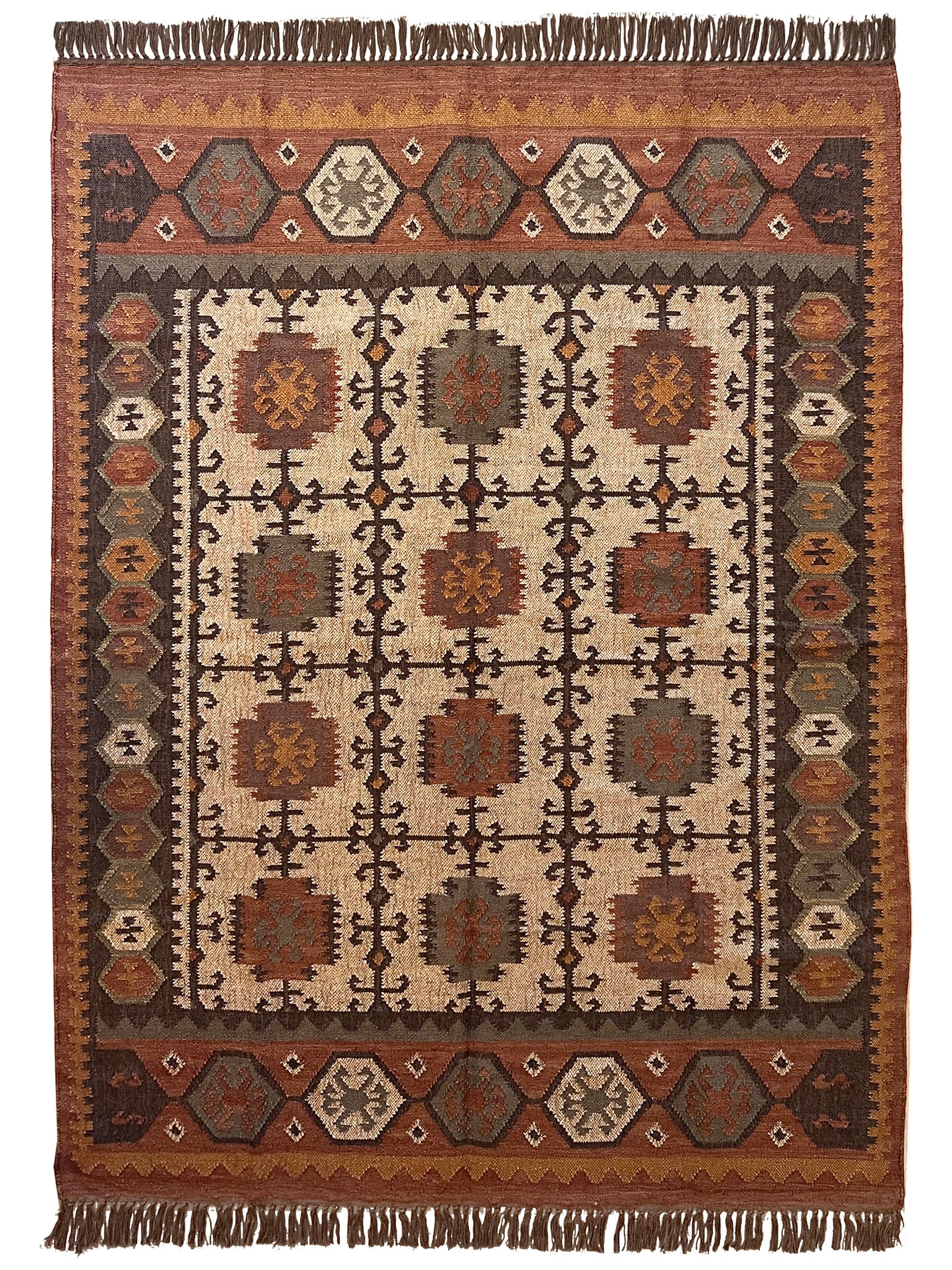 Introducing our Kerala Rug, a handmade rug that exudes warmth and natural beauty. Crafted with a great attention to detail, this rug showcases a captivating blend of earthy tones. From the warm rust and deep mustard to the deep green, each hue harmoniously contrasts with the cream backdrop, and its traditional pattern will bring life to any room.