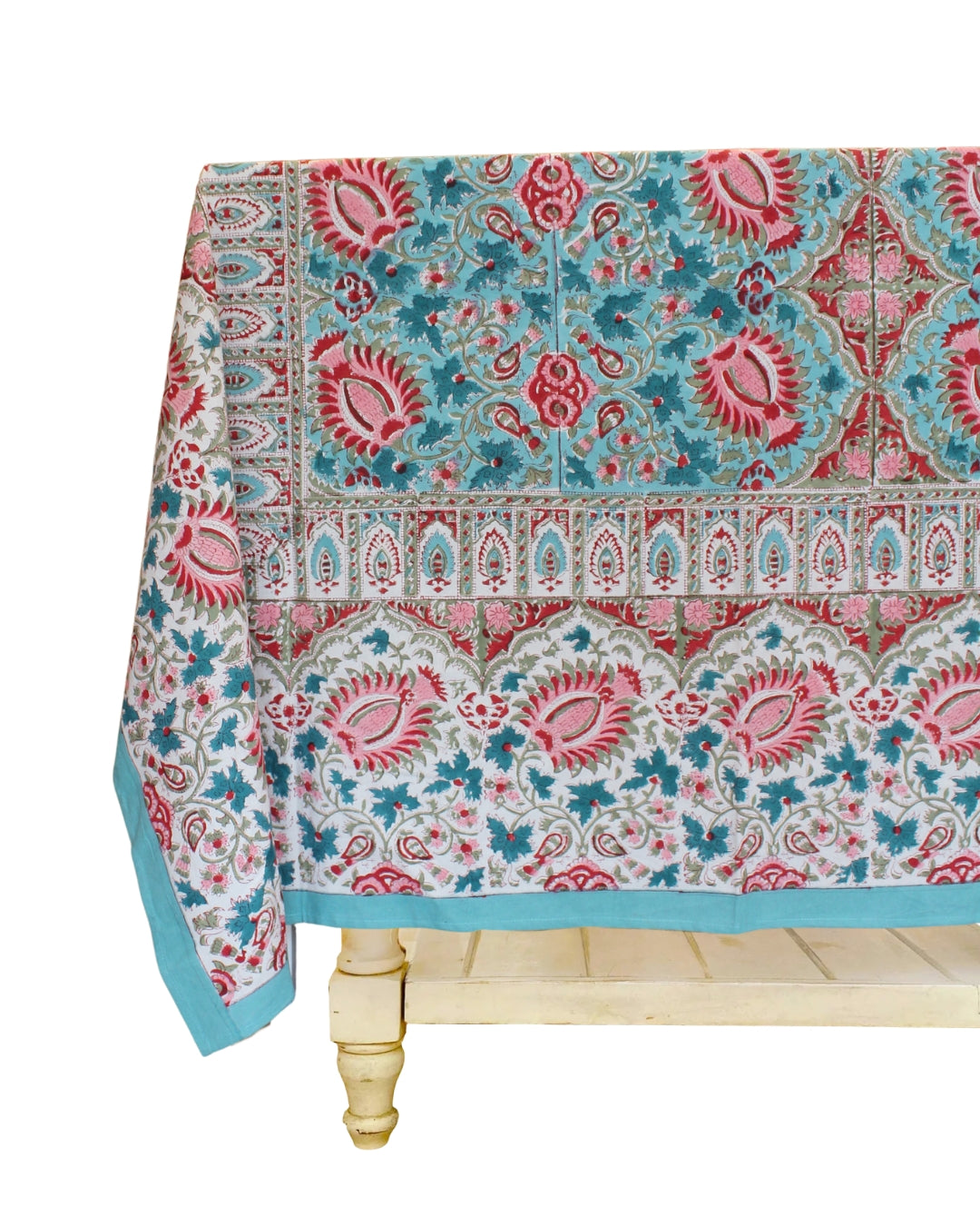 Our Wisteria Tablecloth Spring is crafted from 100% canvas by skilled artisans in India. Using hand block printing, the patterns are carved into wooden blocks, dipped in natural dyes of rich teal and pink, and stamped onto the fabric. This process is repeated to create a bold, beautiful design.