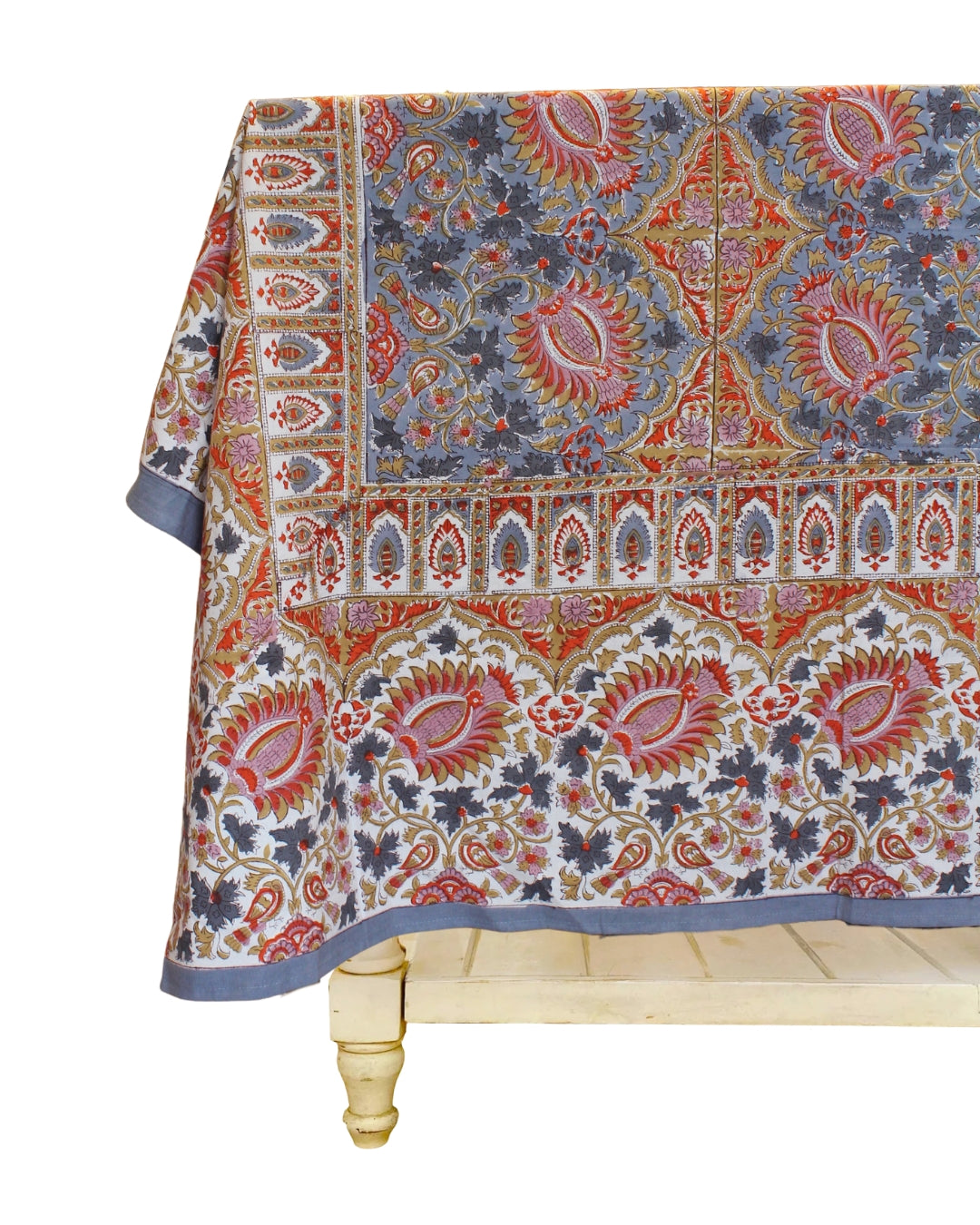 Our Wisteria Tablecloth Autumn is crafted from 100% canvas by skilled artisans in India. Using hand block printing, the patterns are carved into wooden blocks, dipped in natural dyes and stamped onto the fabric. This process is repeated to create a bold, beautiful design that brings warmth and character to any dining space.
