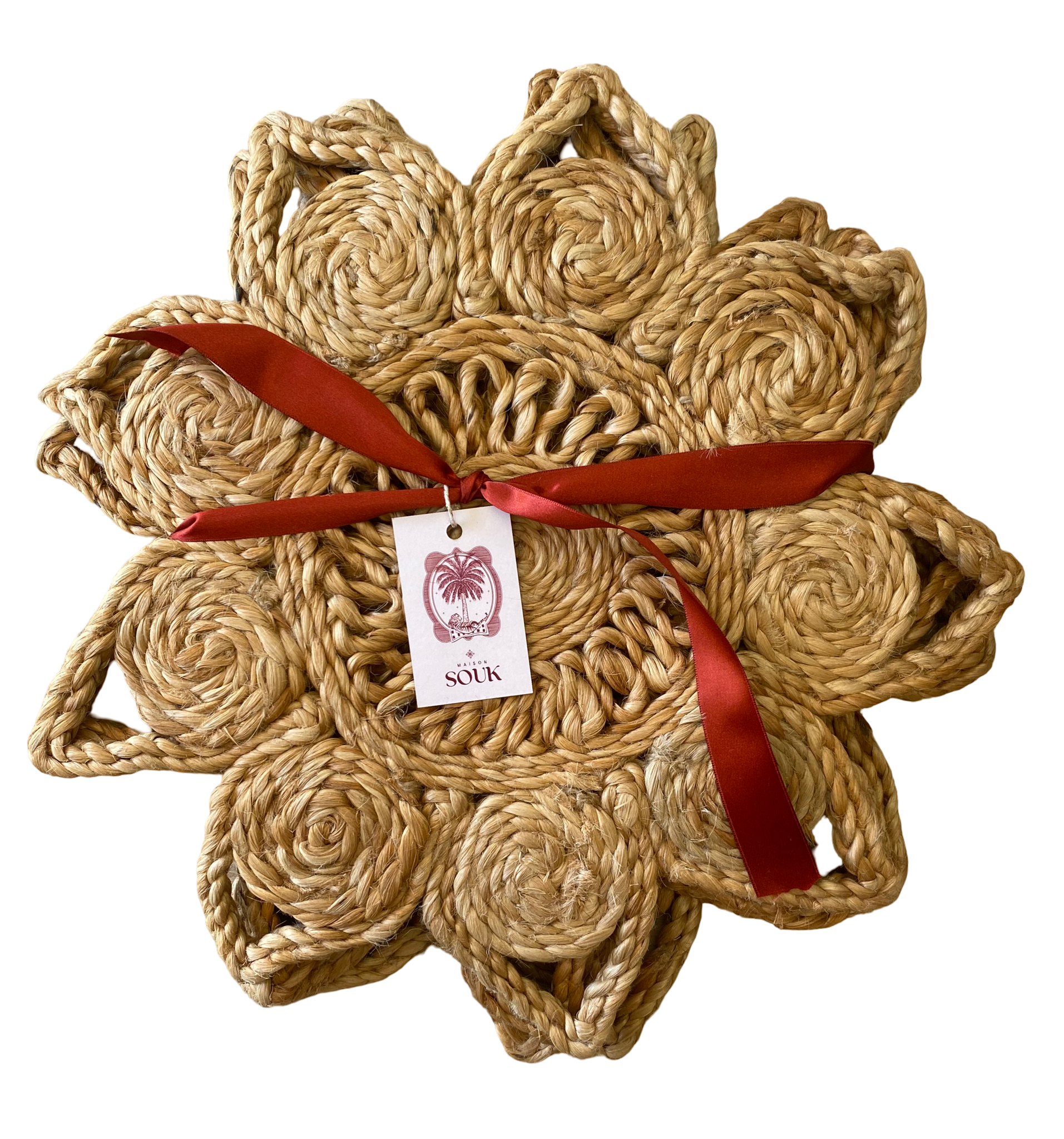 Bring texture and warmth to your table with these handwoven jute placemats. Featuring natural jute and an intricate design, each piece highlights artisanal skill and organic charm.