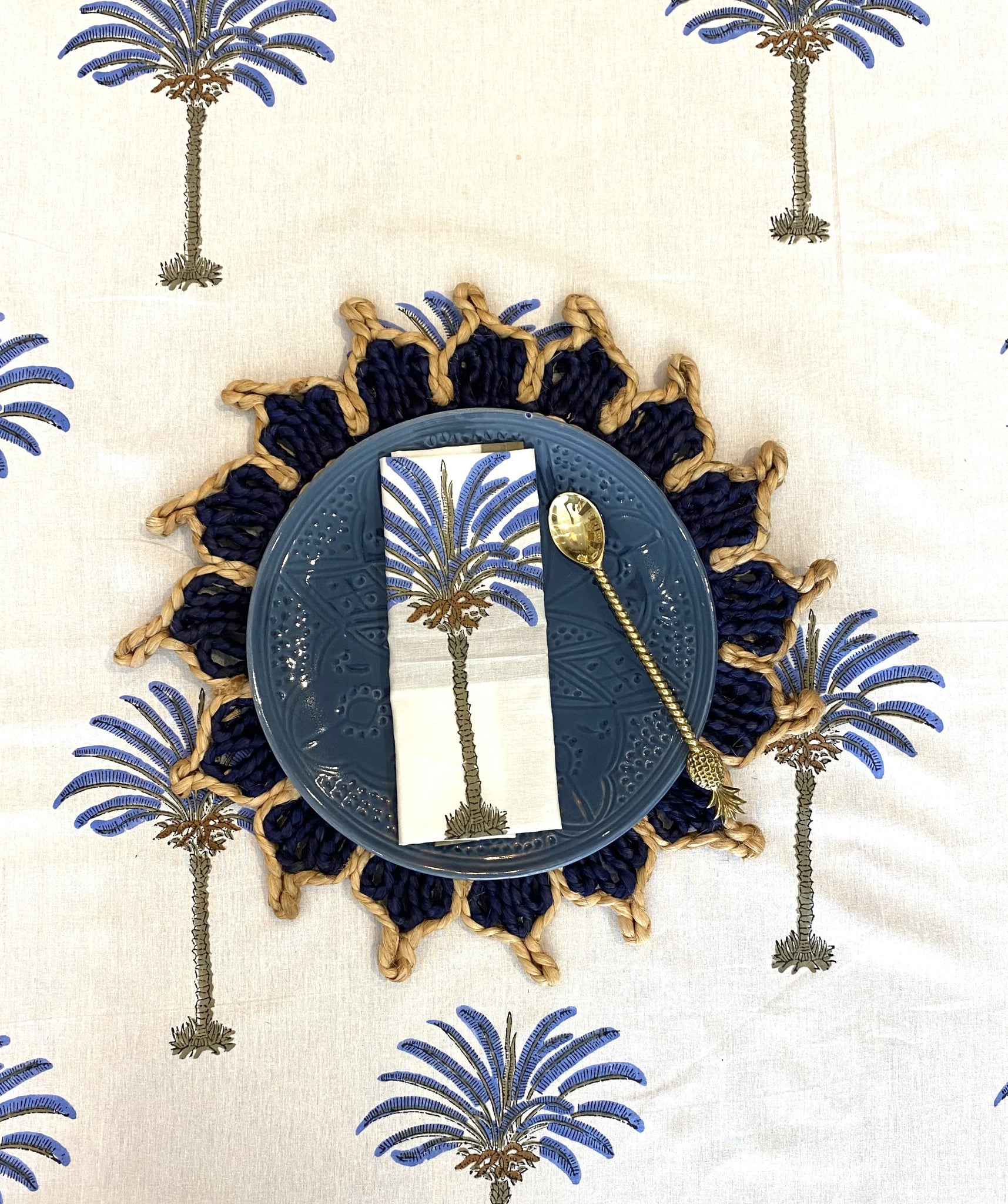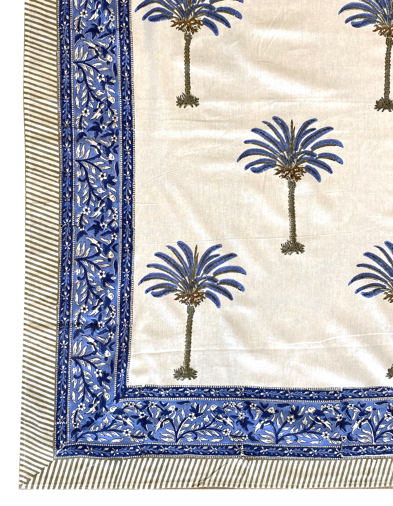 Bring timeless charm to your table with our block-printed tablecloths. Crafted with love and tradition, this exquisite tablecloth features intricate palm tree motifs and bold borders, creating the perfect blend of elegance and warmth. Whether for everyday dining or special gatherings, it adds a graceful touch to any setting.