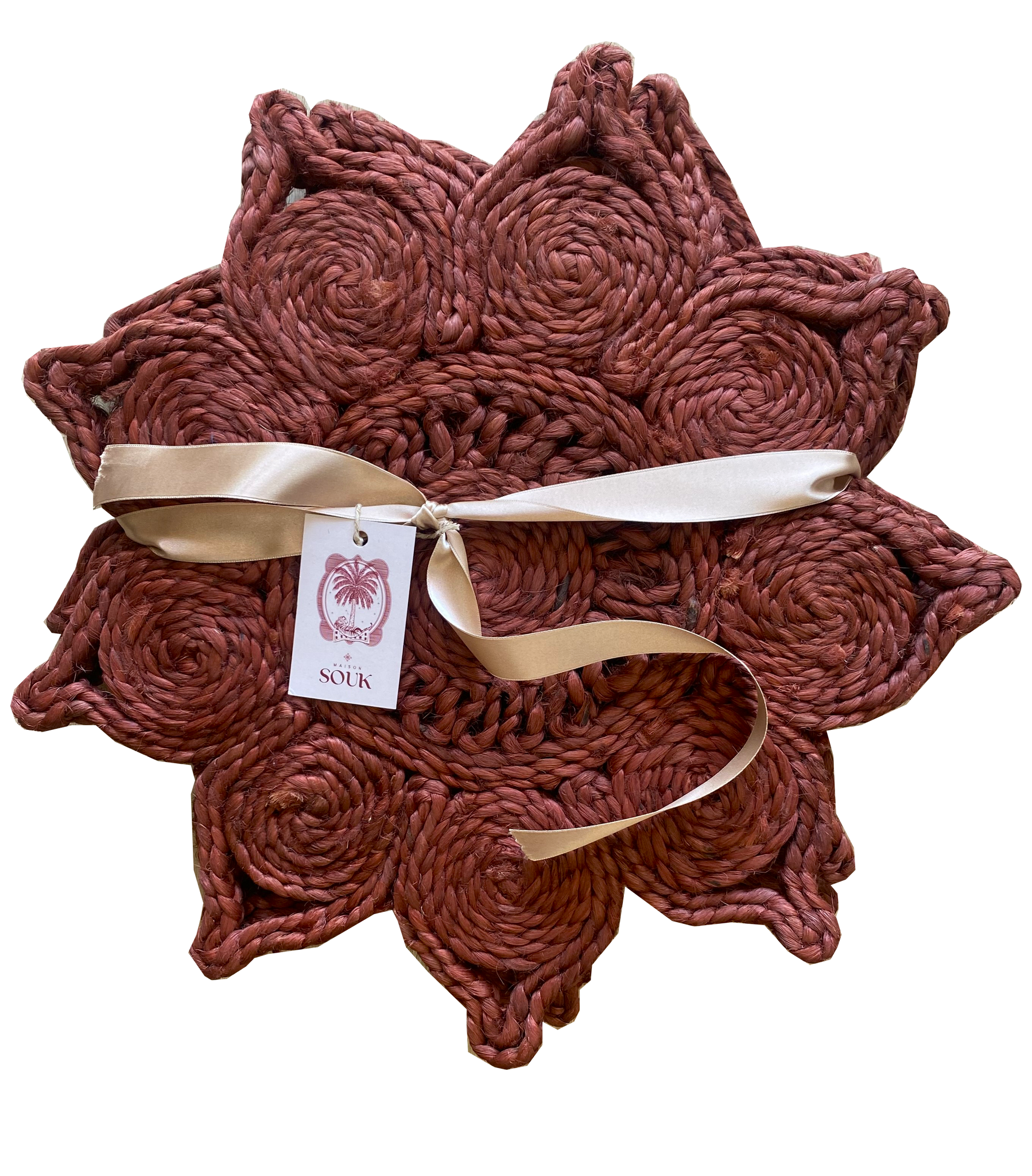 Bring texture and a pop of colour to your table with these handwoven jute placemats. Featuring a deep crimson hue and an intricate design, each piece highlights artisanal skill and organic charm.