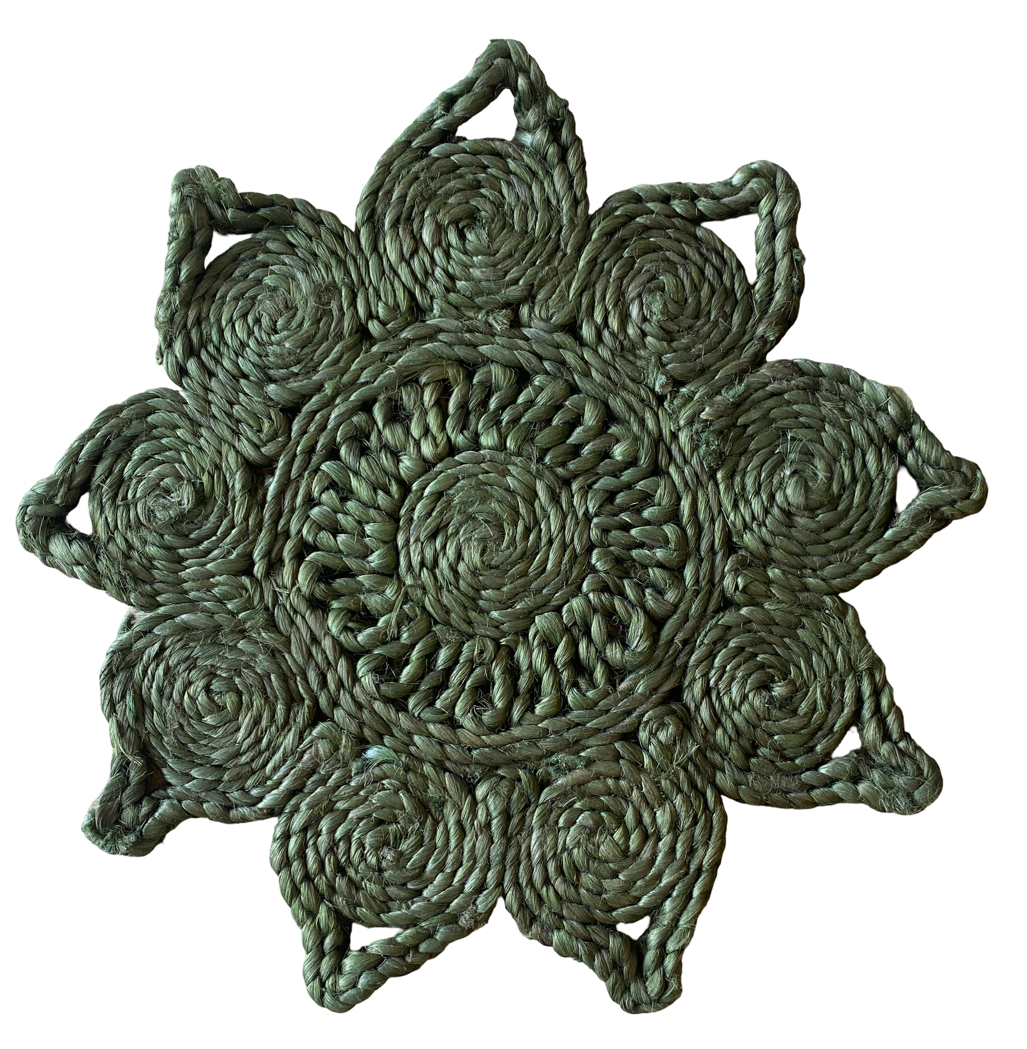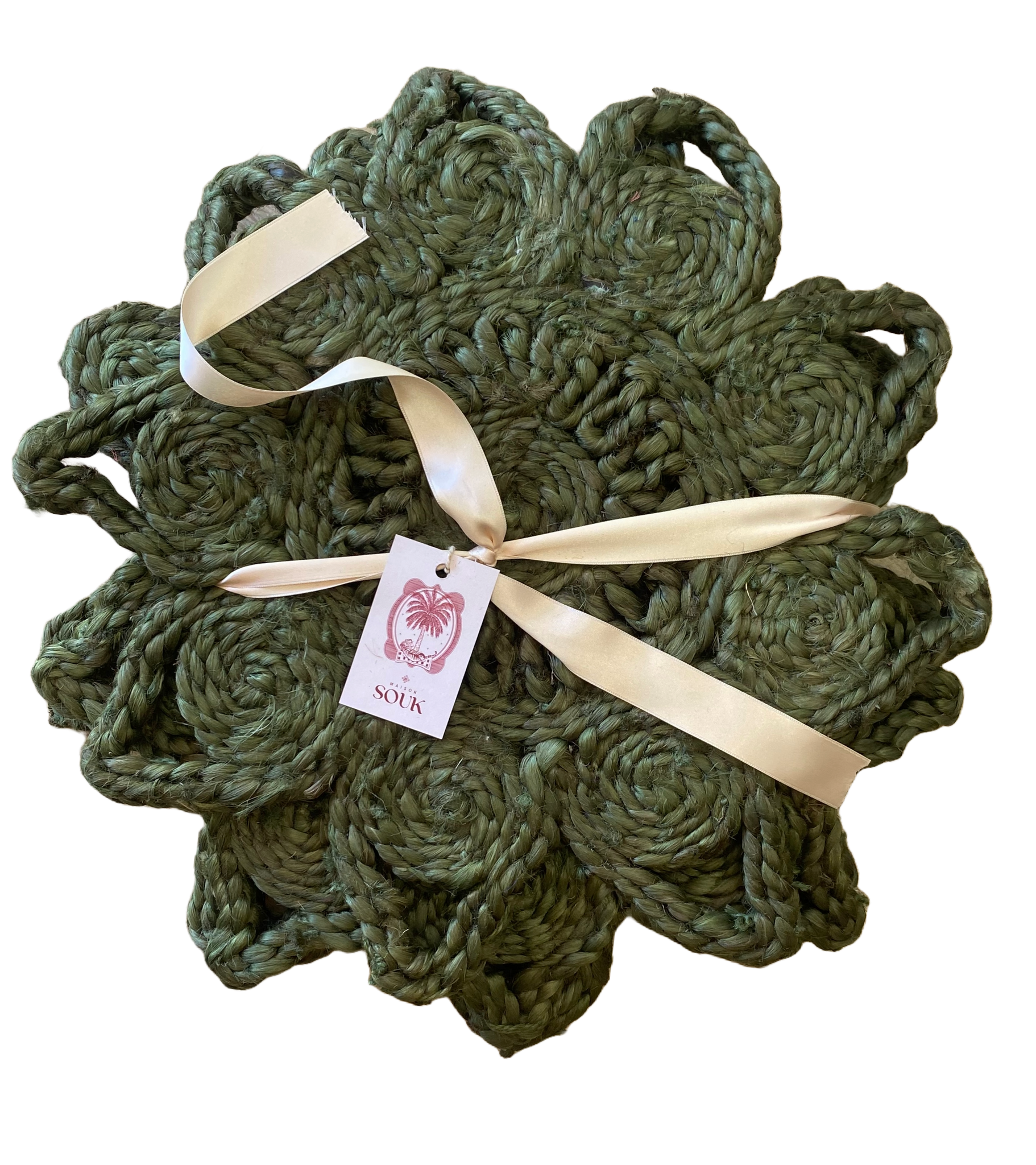 Bring texture and a pop of colour to your table with these handwoven jute placemats. Featuring a deep olive green hue and an intricate design, each piece highlights artisanal skill and organic charm.
